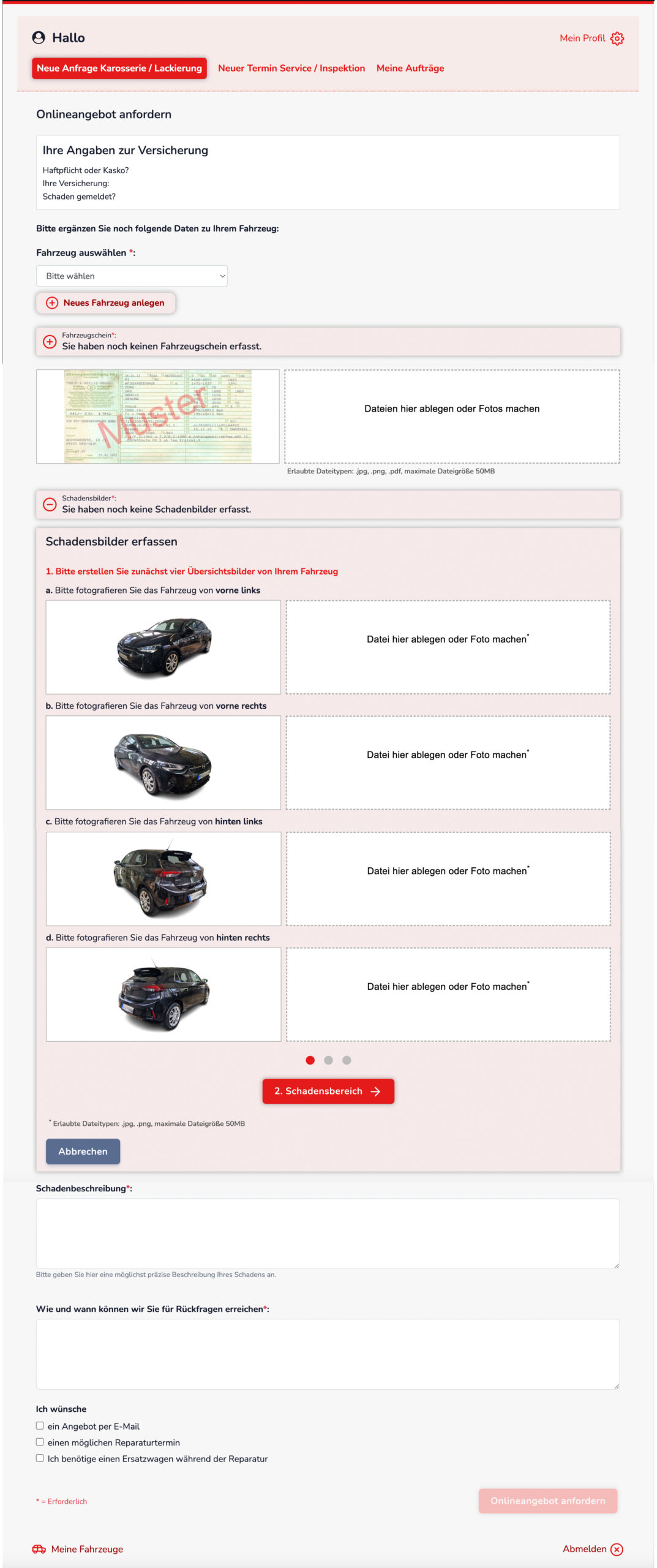 Im Tab „Schadensbereich“ wählen Sie bitte, wie viele Schäden Sie melden möchten und übermitteln uns folgende Bilder: