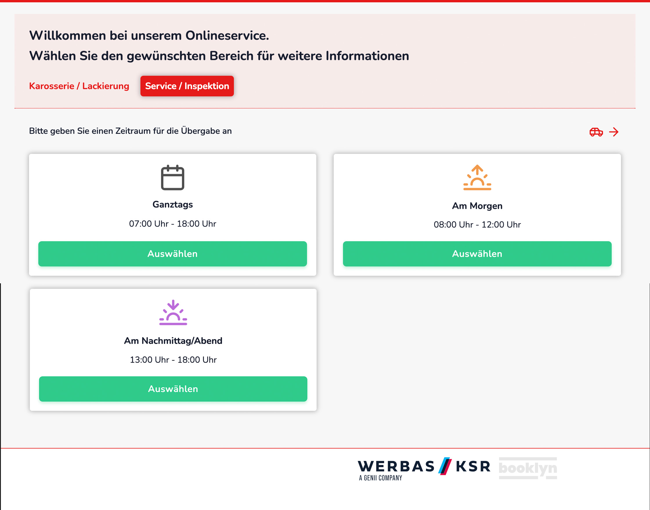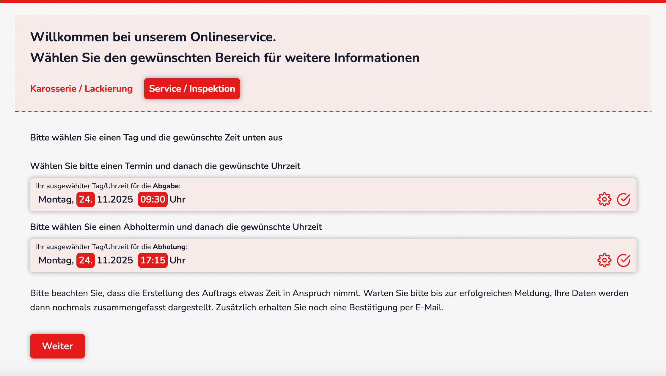 Zusammenfassung Ihrer gewählten Abgabe und Abholung Ihres Fahrzeugs. Bitte beachten Sie, dass die Abholung Ihres Fahrzeugs unter Umständen sich verzögern kann, z.B. bei Bestellung eines Ersatzteils.