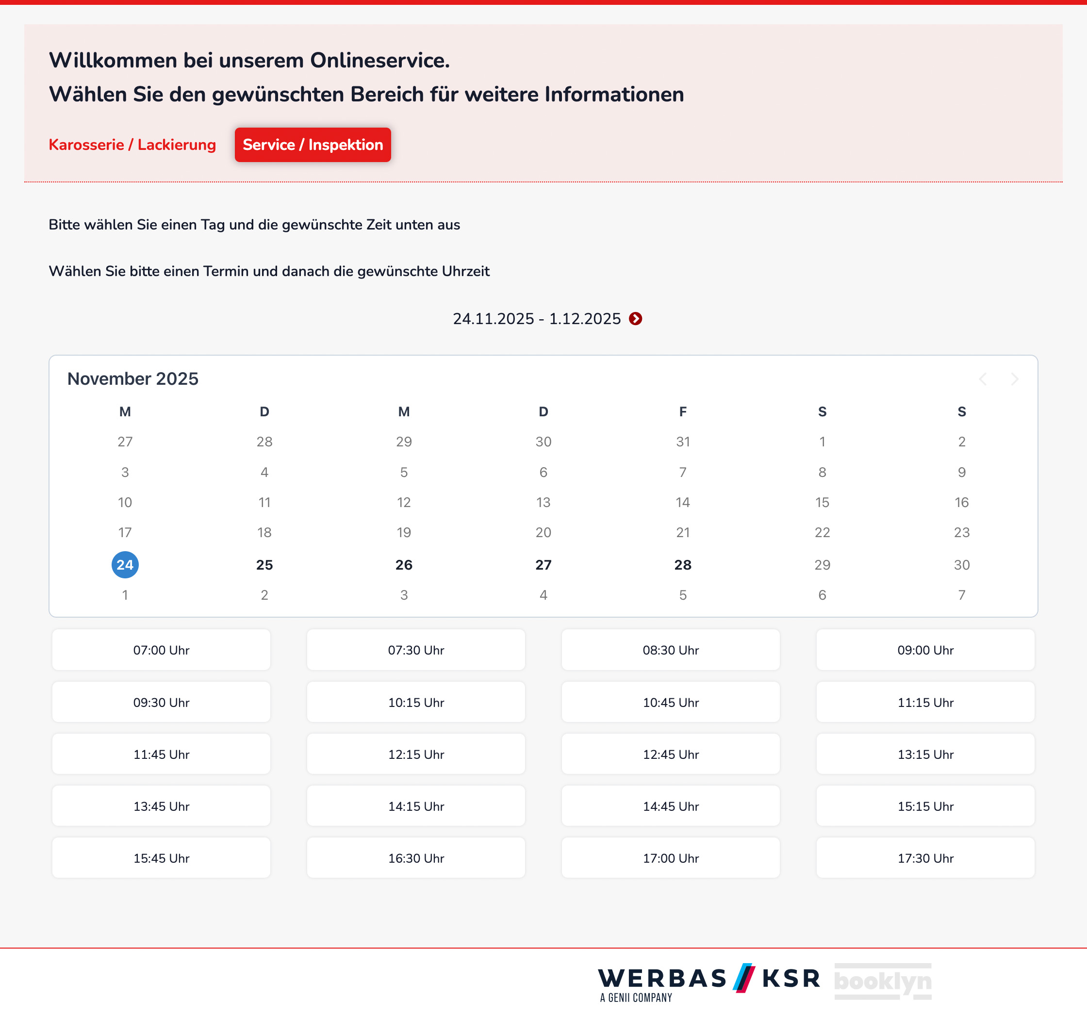 Um einen Werkstatttermin z.B. für eine Inspektion zu buchen, wählen Sie im ersten Schritt bitte „Service / Inspektion“ Für eine leichtere Abwicklung und Nachverfolgung Ihrer Terminanfrage erstellen Sie bitte ein Kundenkonto oder melden sich an.